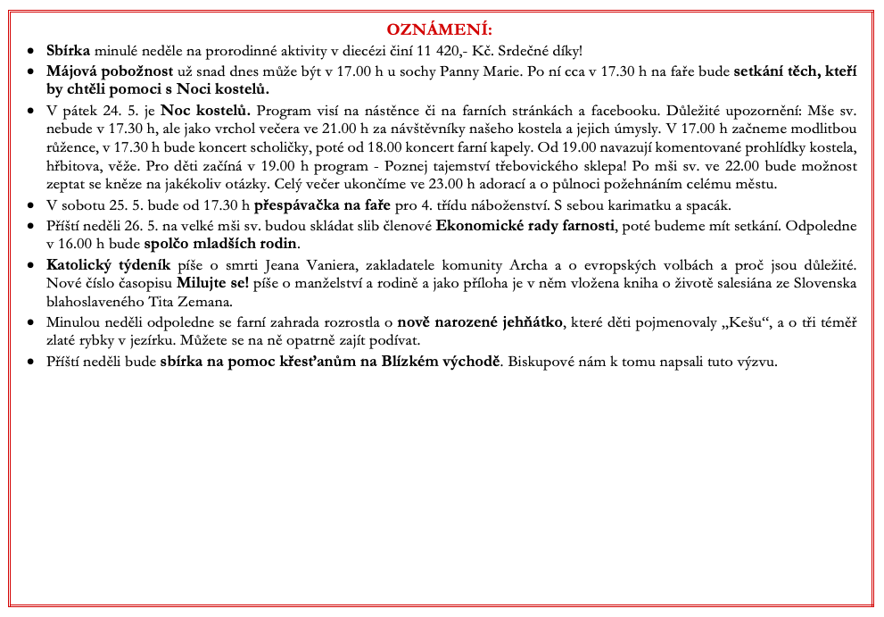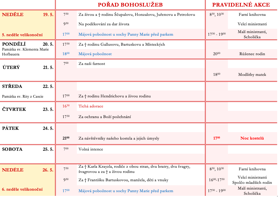 Ohlášky k 19. květnu V neděli 19. května slavíme 5. neděli Velikonoční.Prohlédněte si pořad bohoslužeb a ohlášky. Previous postOhlášky k 12. květnu Next postOhlášky k 26. květnu Komentáře nejsou povoleny.