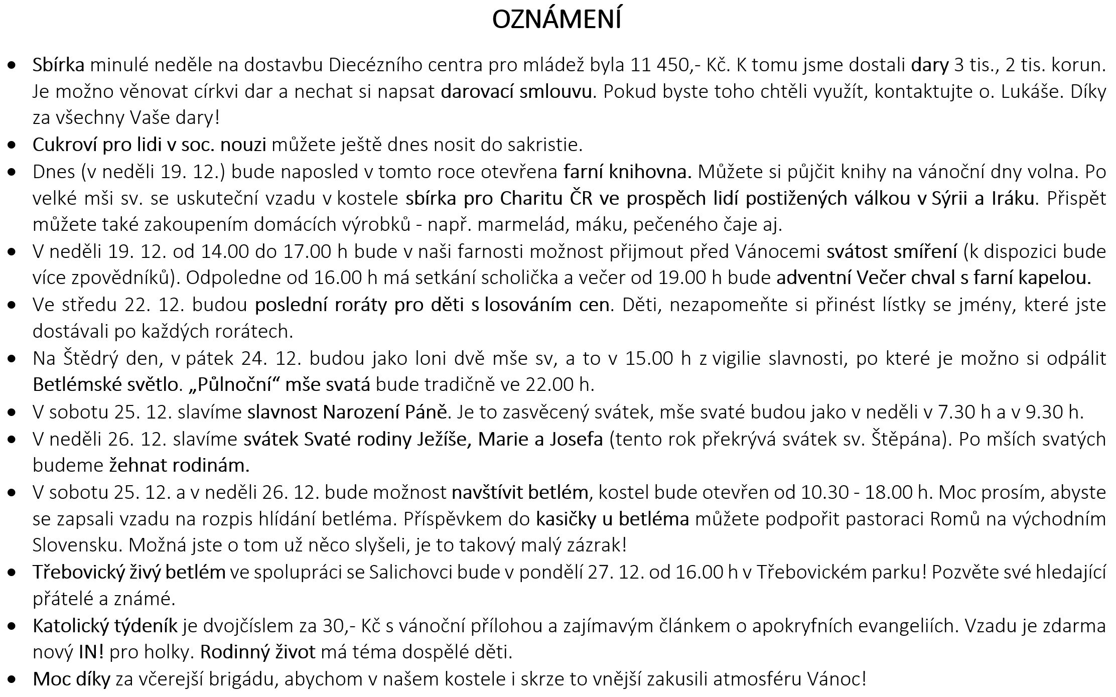 Ohlášky k 19. prosinci V neděli 19. prosince slavíme 4. NEDĚLI ADVENTNÍ. Prohlédněte si pořad bohoslužeb a ohlášky. Previous postOhlášky k 12. prosinci Next postOhlášky k 26. prosinci Komentáře nejsou povoleny.