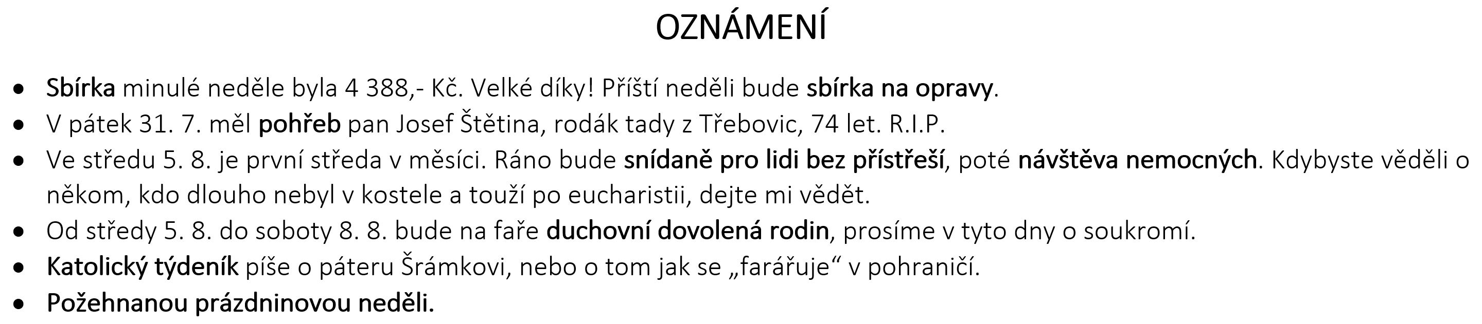 Ohlášky k 2. srpnu V neděli 2. srpna slavíme 18. NEDĚLI V MEZIDOBÍ. Prohlédněte si pořad bohoslužeb a ohlášky. Previous postOhlášky k 26. červenci Next postOhlášky k 9. srpnu Komentáře nejsou povoleny.