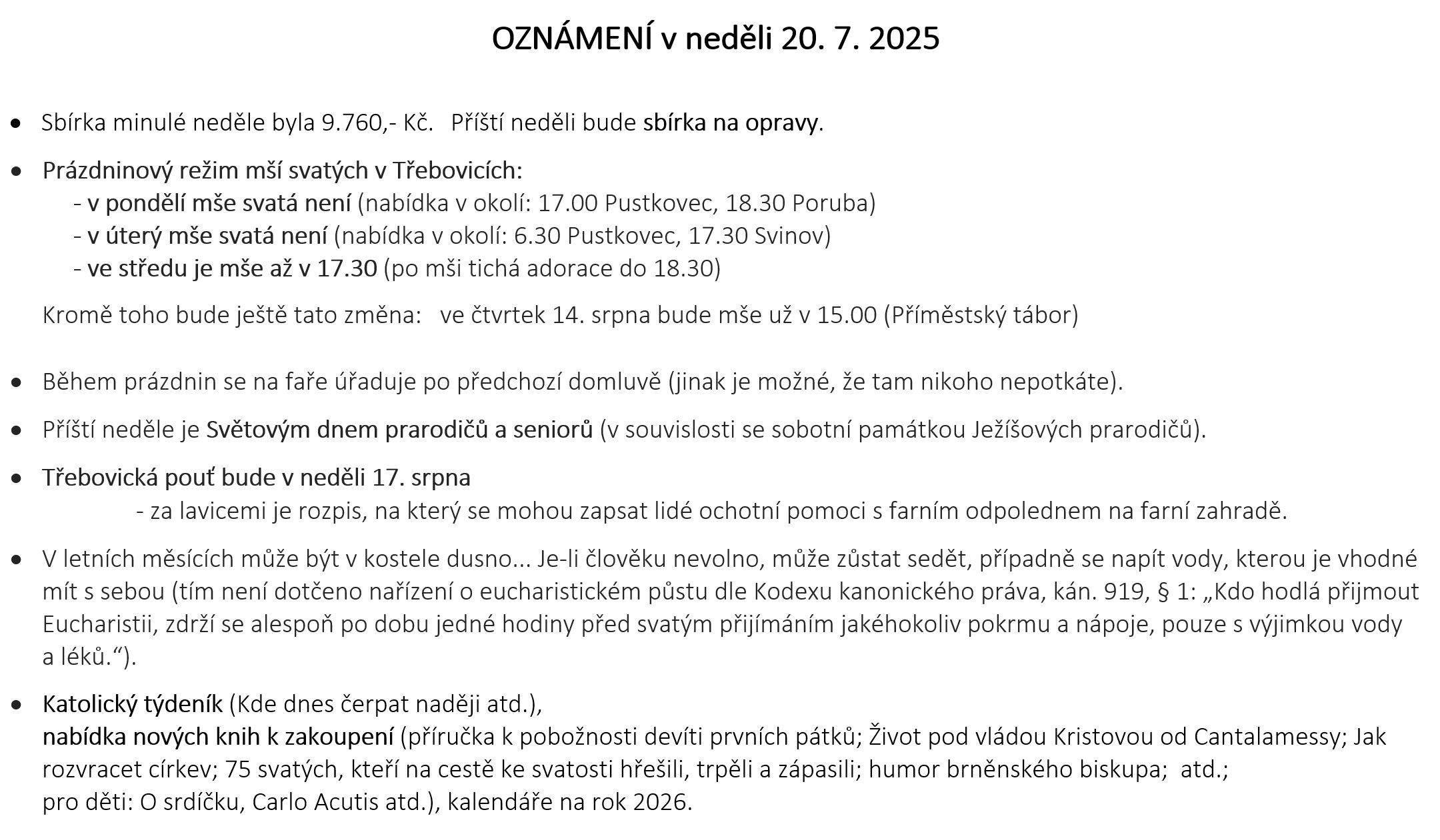 Ohlášky k 20. červenci V neděli 20. července slavíme 16. NEDĚLI V MEZIDOBÍ. Prohlédněte si pořad bohoslužeb a ohlášky: Previous postOhlášky k 13. červenci Next postOhlášky k 27. červenci Komentáře nejsou povoleny.