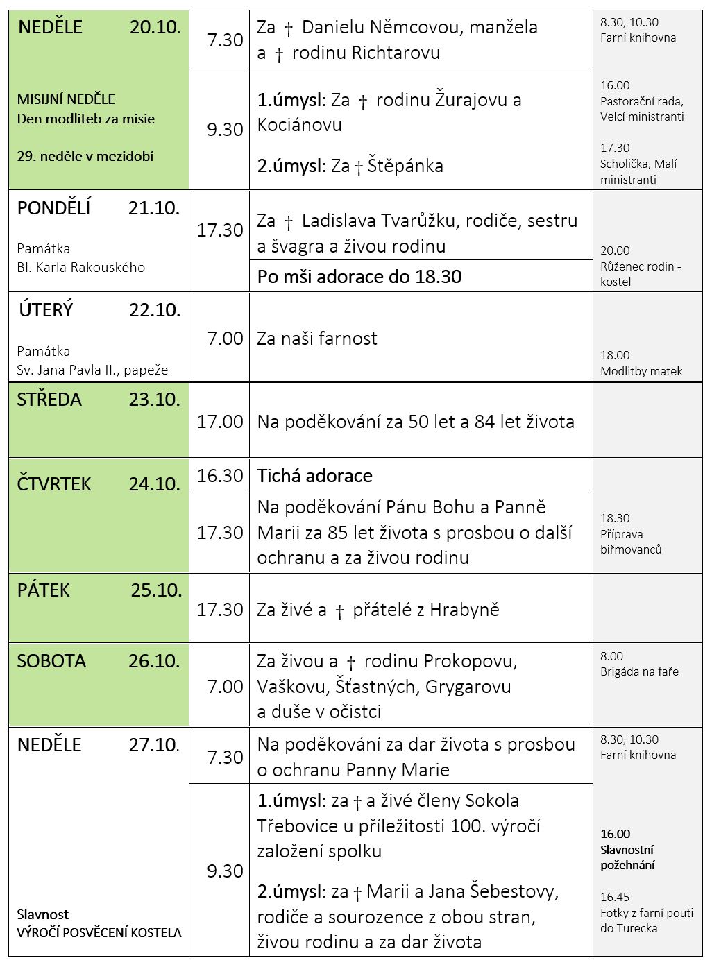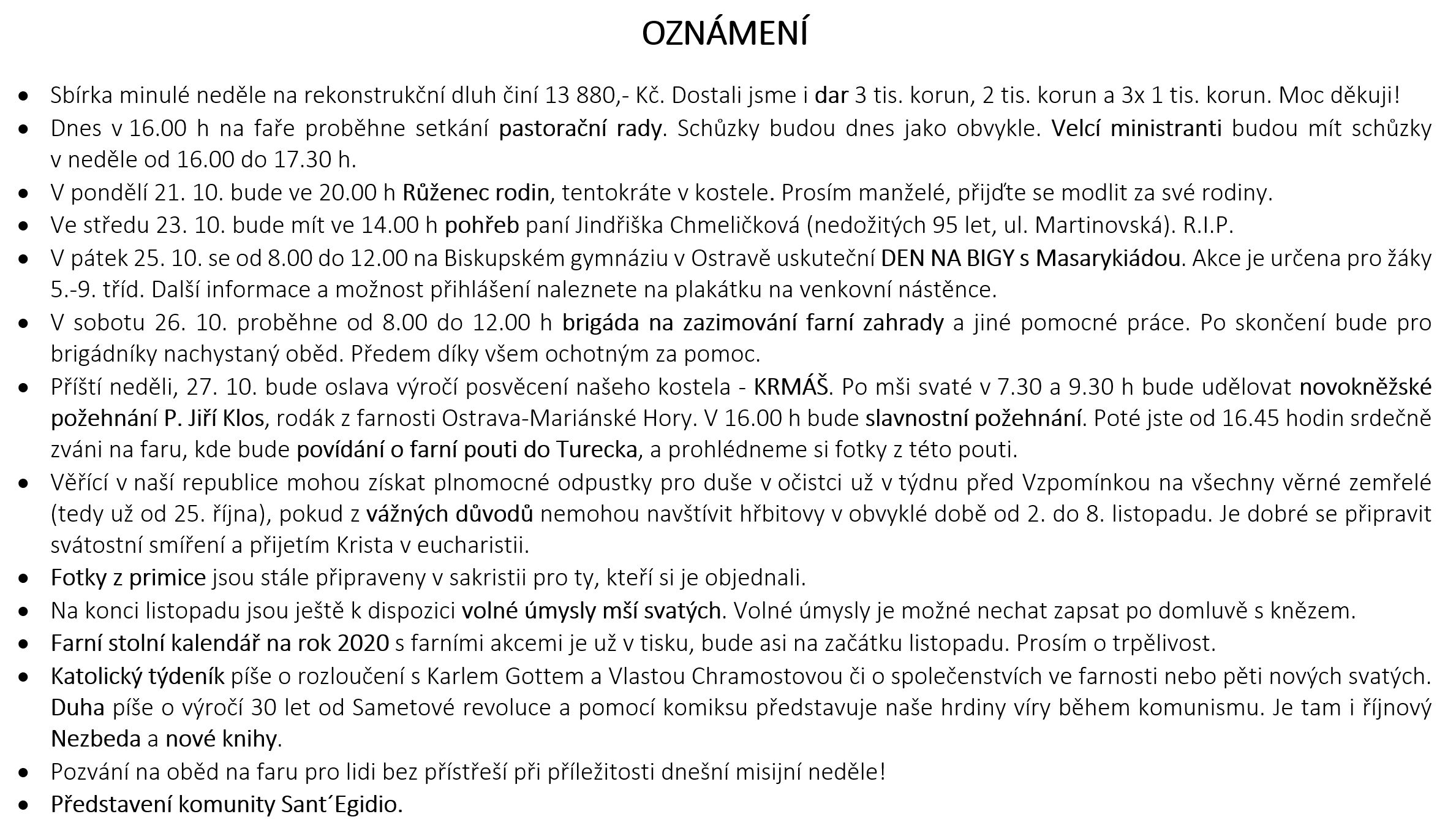 V neděli 20. října slavíme 29. neděli v mezidobí. Prohlédněte si pořad bohoslužeb a ohlášky.
