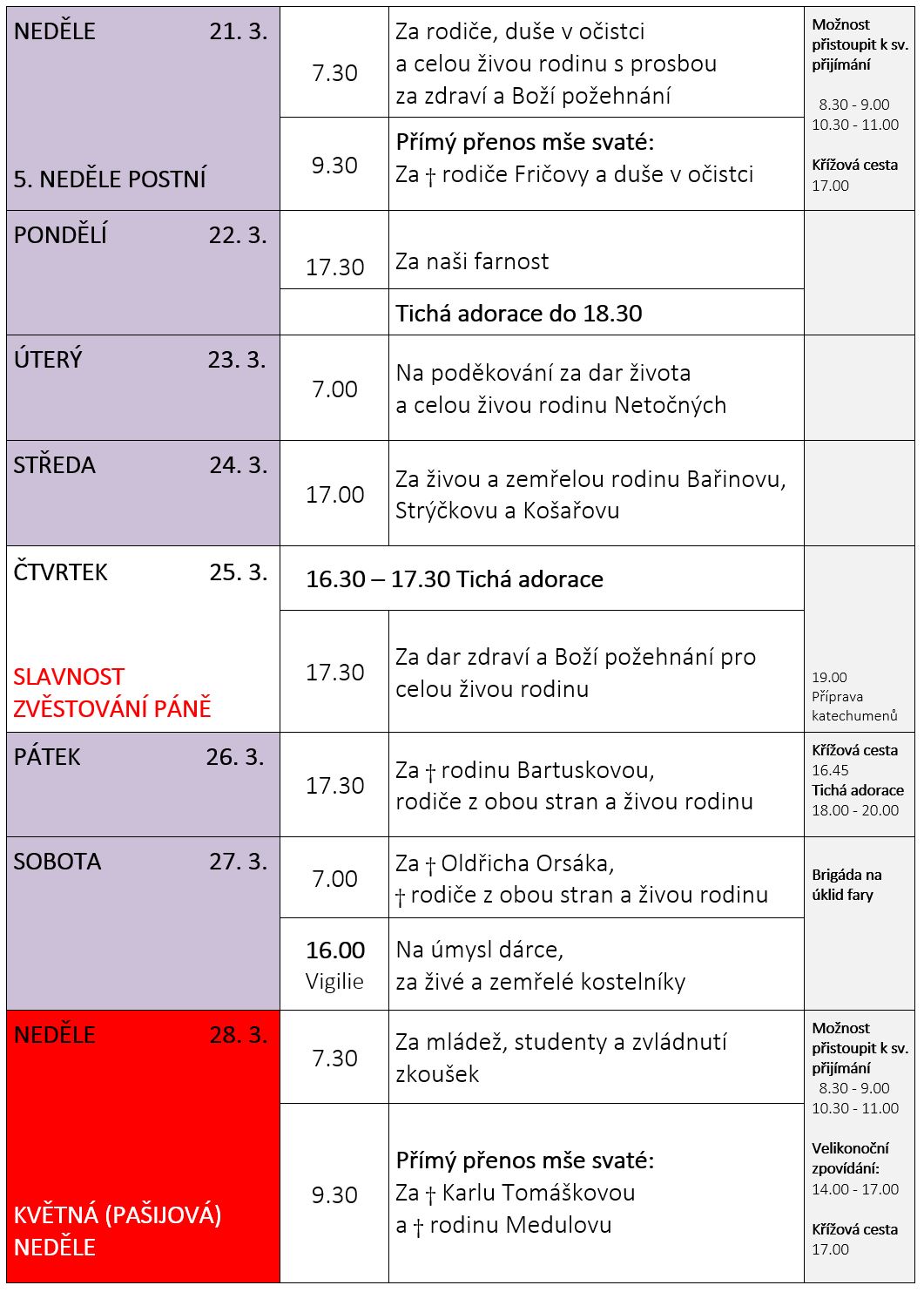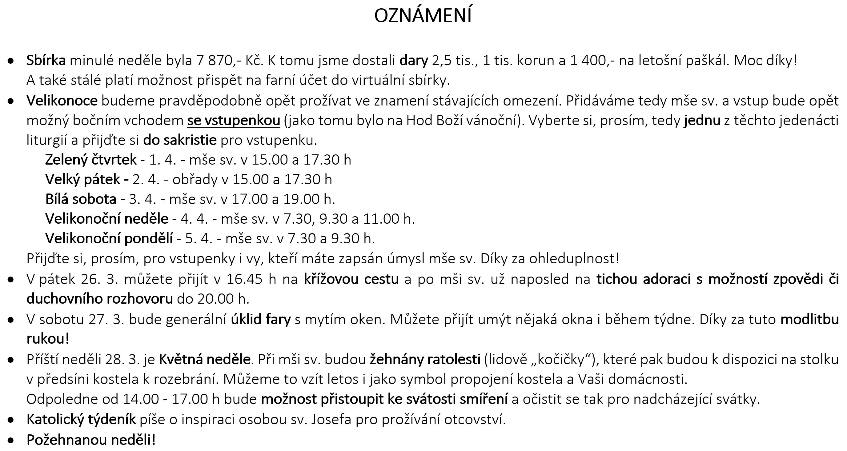 V neděli 21. března slavíme 5. NEDĚLI POSTNÍ. Prohlédněte si pořad bohoslužeb a ohlášky.