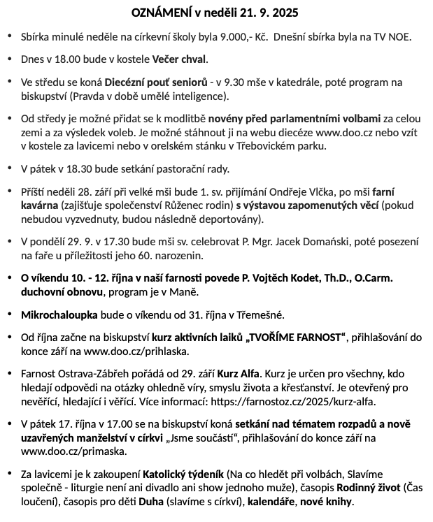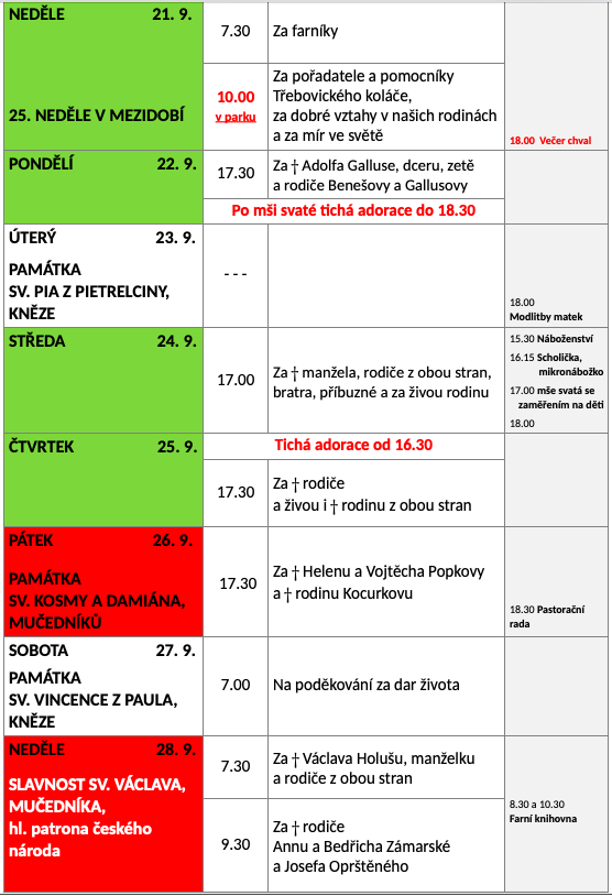 V neděli 21. září slavíme 25. neděli v mezidobí. Prohlédněte si pořad bohoslužeb a ohlášky: