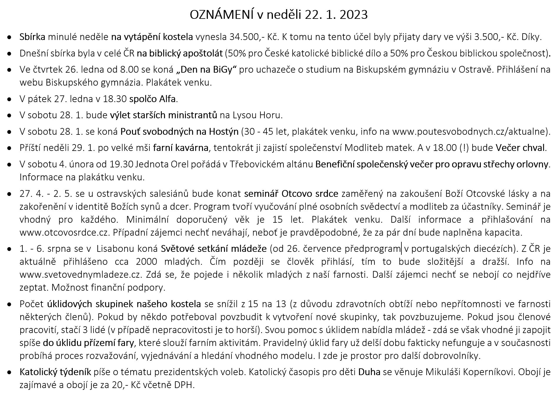 Ohlášky k 22. lednu V neděli 22. ledna slavíme 3. NEDĚLI V MEZIDOBÍ. Prohlédněte si pořad bohoslužeb a ohlášky. Previous postOhlášky k 15. lednu Next postOhlášky k 29. lednu Komentáře nejsou povoleny.