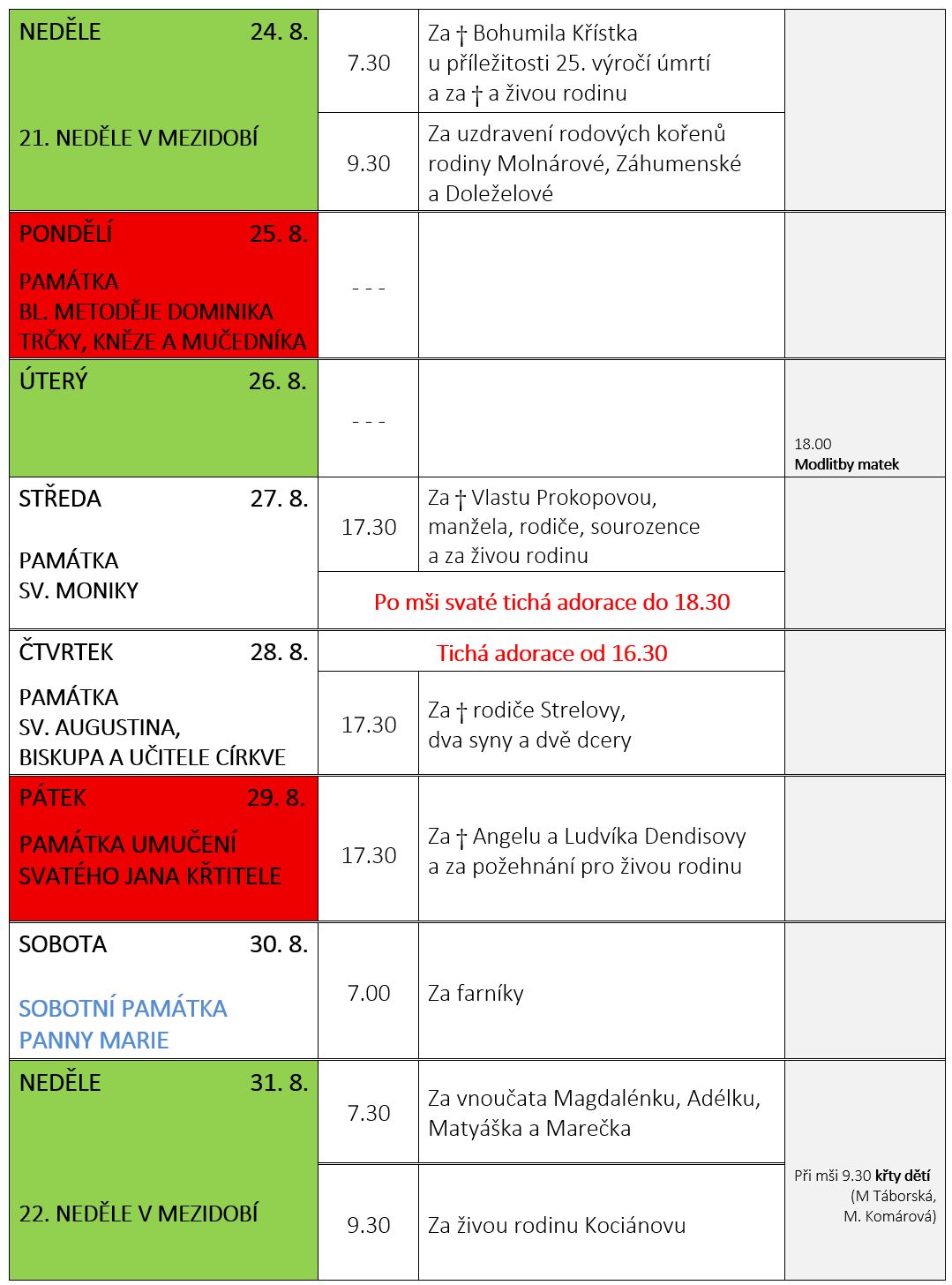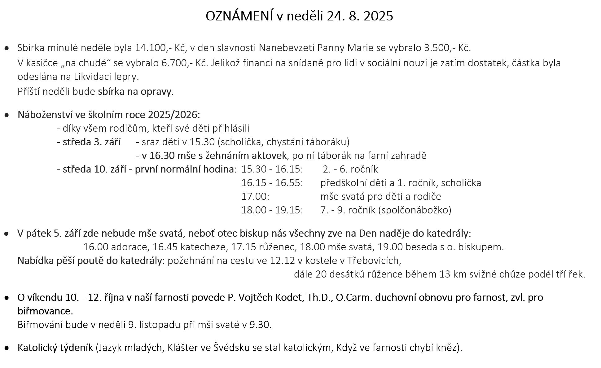 Ohlášky k 24. srpnu V neděli 24. srpna slavíme 21. NEDĚLI V MEZIDOBÍ. Prohlédněte si pořad bohoslužeb a ohlášky: Previous postOhlášky k 17. srpnu Next postOhlášky k 31. srpnu Komentáře nejsou povoleny.