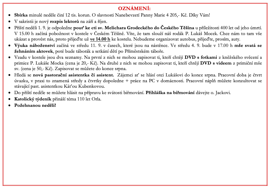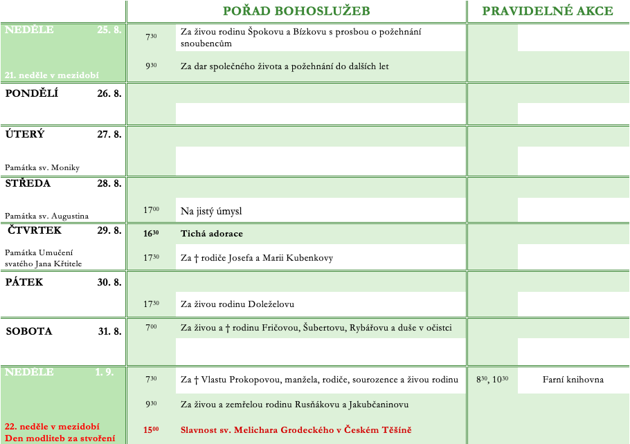 V neděli 25. srpna slavíme 21. neděli v mezidobí. Prohlédněte si pořad bohoslužeb a ohlášky.