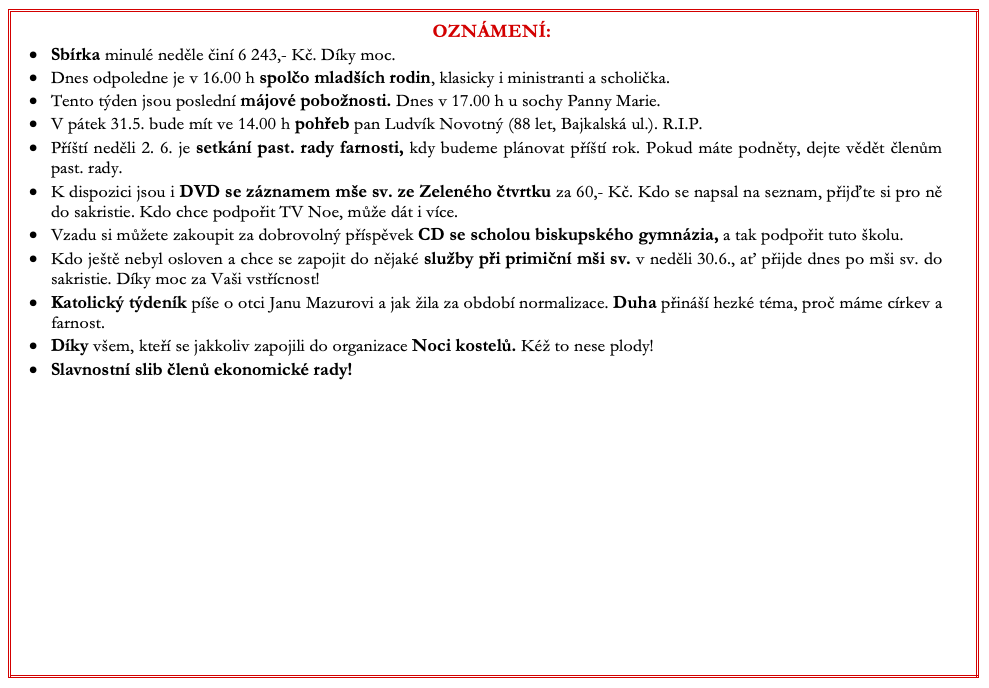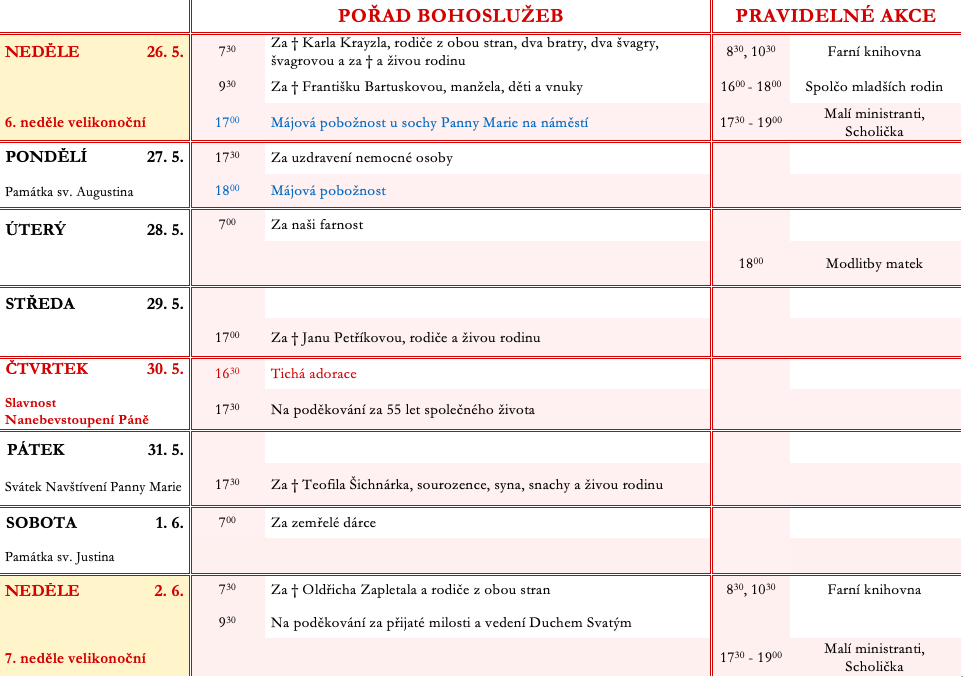 Ohlášky k 26. květnu V neděli 26. května slavíme 6. neděli Velikonoční.Prohlédněte si pořad bohoslužeb a ohlášky. Previous postOhlášky k 19. květnu Next postOhlášky k 2. červnu Komentáře nejsou povoleny.