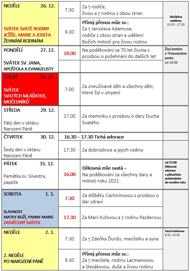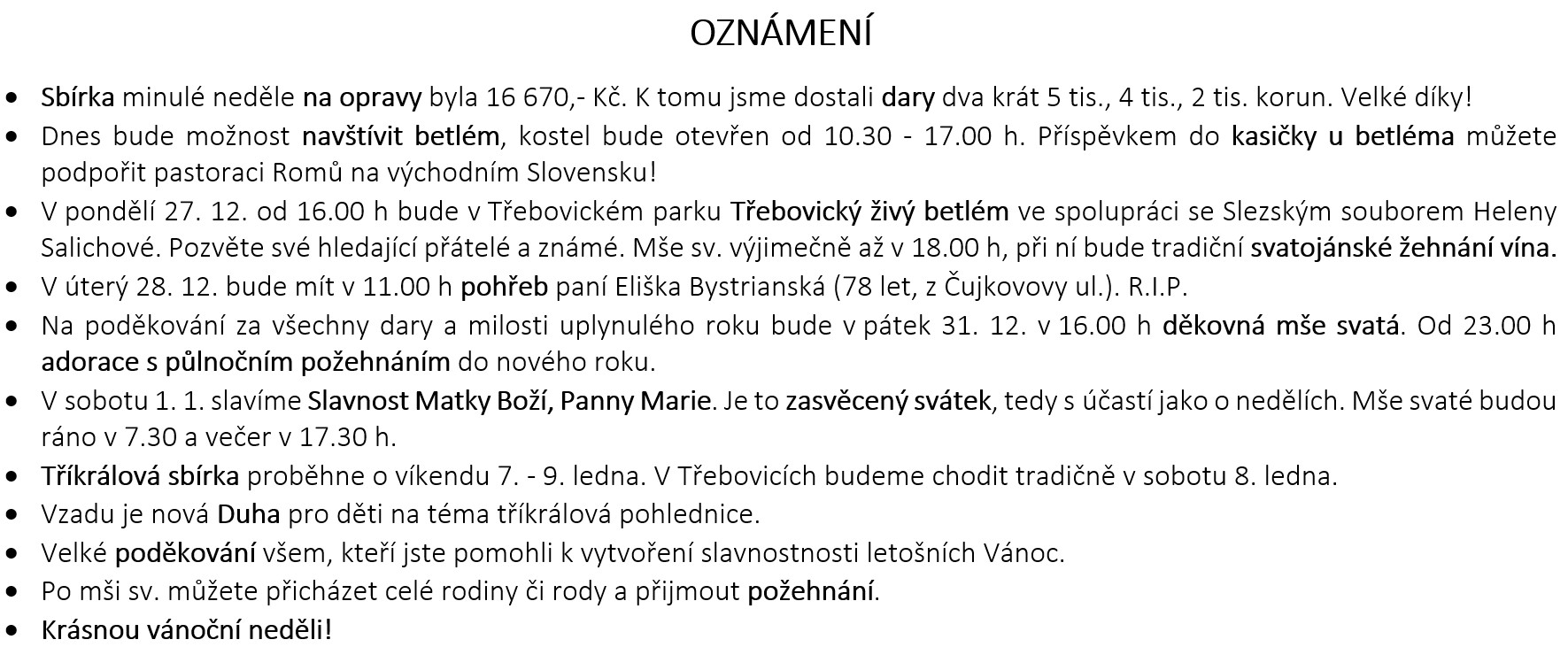 V neděli 26. prosince slavíme SVÁTEK SVATÉ RODINY JEŽÍŠE, MARIE A JOSEFA. Prohlédněte si pořad bohoslužeb a ohlášky.