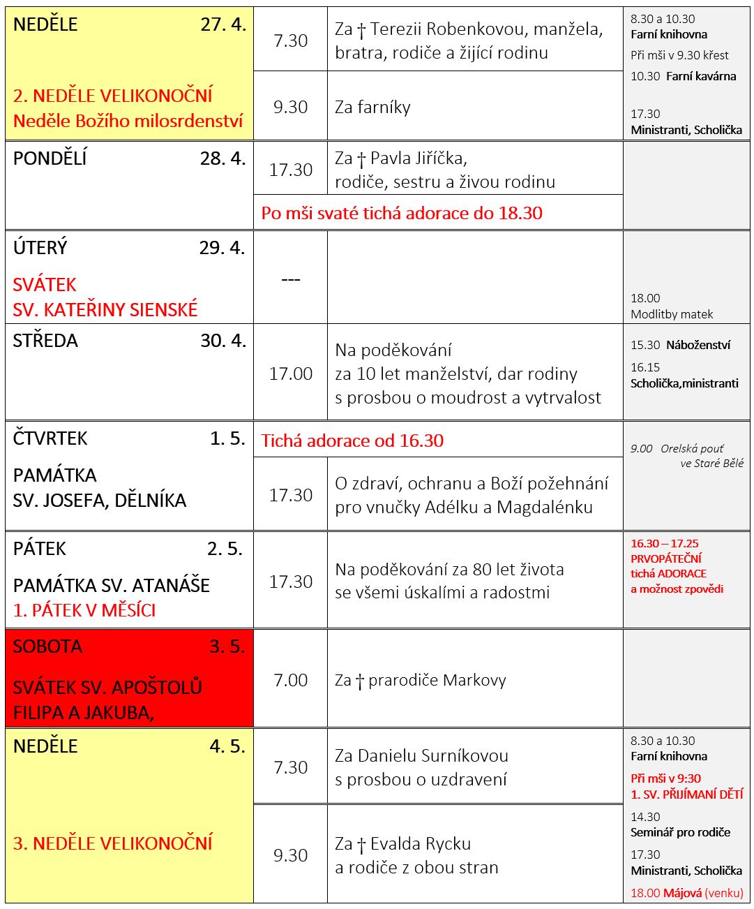 V neděli 27. dubna slavíme 2. NEDĚLI VELIKONOČNÍ – Neděli Božího milosrdenství. Prohlédněte si pořad bohoslužeb a ohlášky: