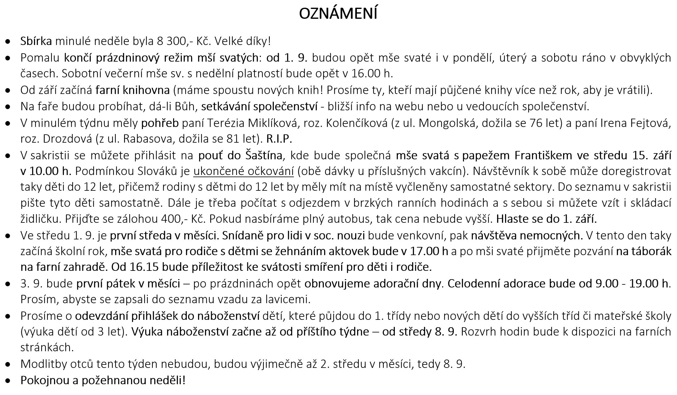 Ohlášky k 29. srpnu V neděli 29. srpna slavíme 22. NEDĚLI V MEZIDOBÍ. Prohlédněte si pořad bohoslužeb a ohlášky. Previous postOhlášky k 22. srpnu Next postOhlášky k 5. září Komentáře nejsou povoleny.