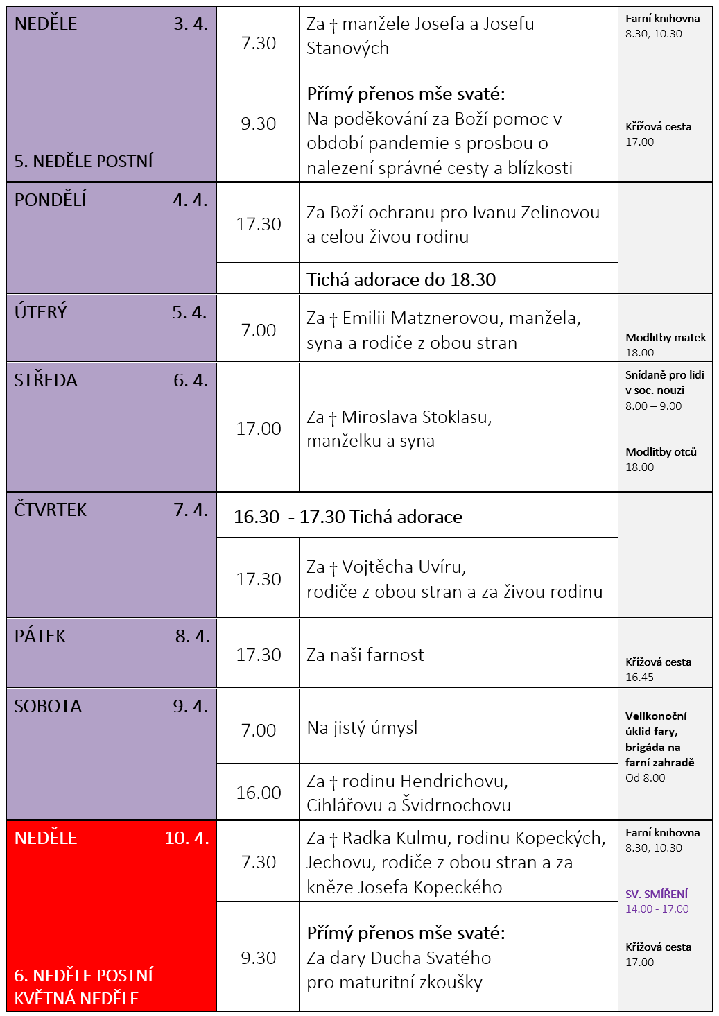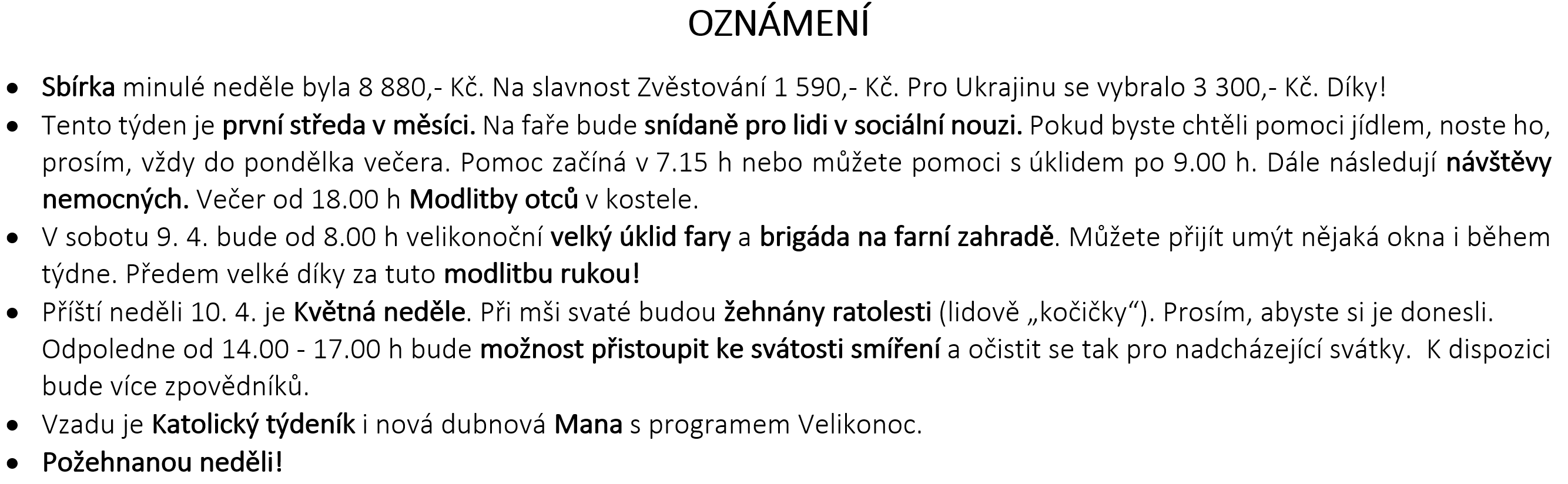 Ohlášky k 3. dubnu V neděli 3. dubna slavíme 5. NEDĚLI POSTNÍ. Prohlédněte si pořad bohoslužeb a ohlášky. Previous postOhlášky k 27. březnu Next postOhlášky k 10. dubnu Komentáře nejsou povoleny.