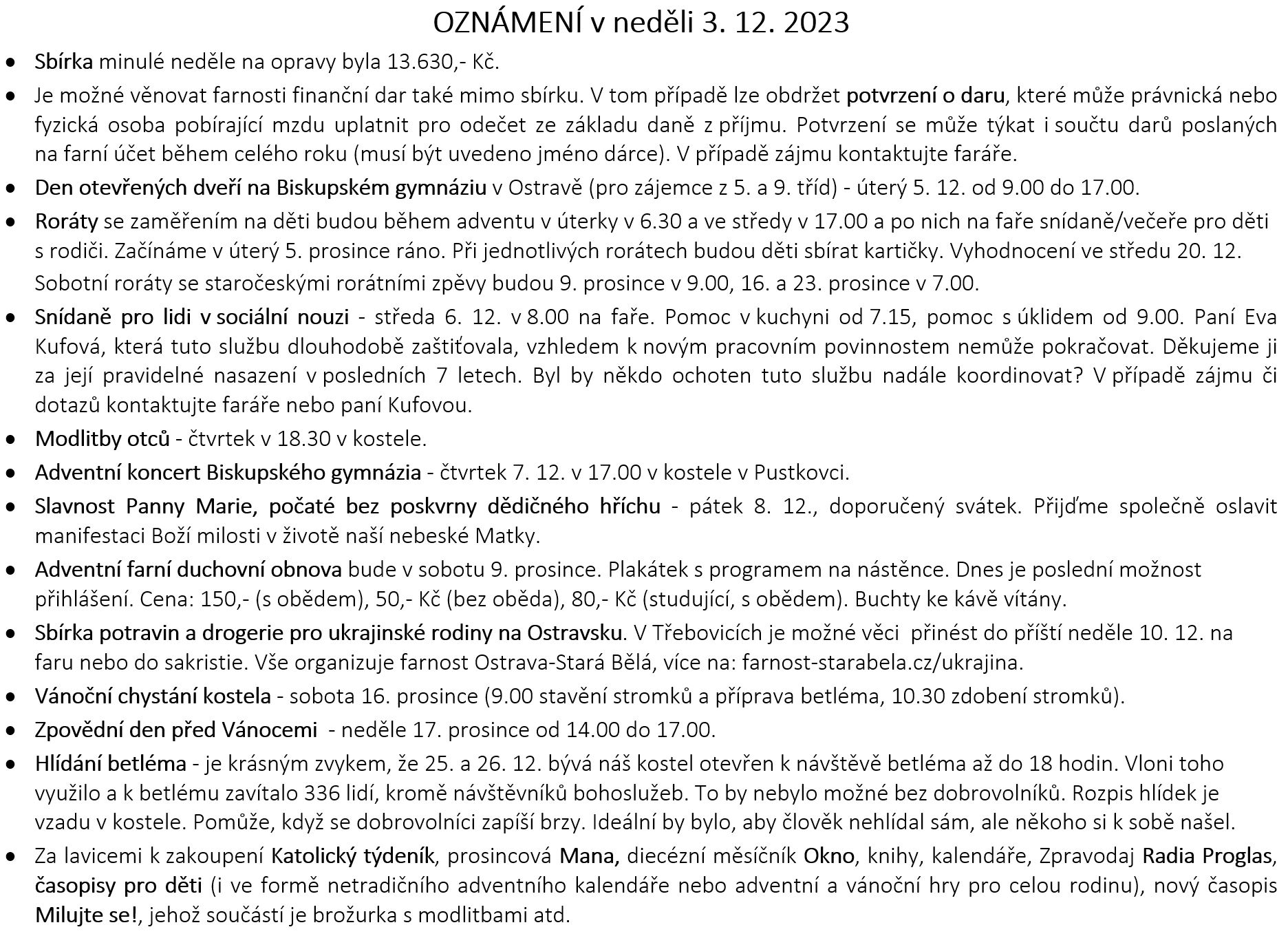 Ohlášky k 3. prosinci V neděli 3. prosince slavíme 1. NEDĚLI ADVENTNÍ. Prohlédněte si pořad bohoslužeb a ohlášky. Previous postOhlášky k 26. listopadu Next postOhlášky k 10. prosinci Komentáře nejsou povoleny.