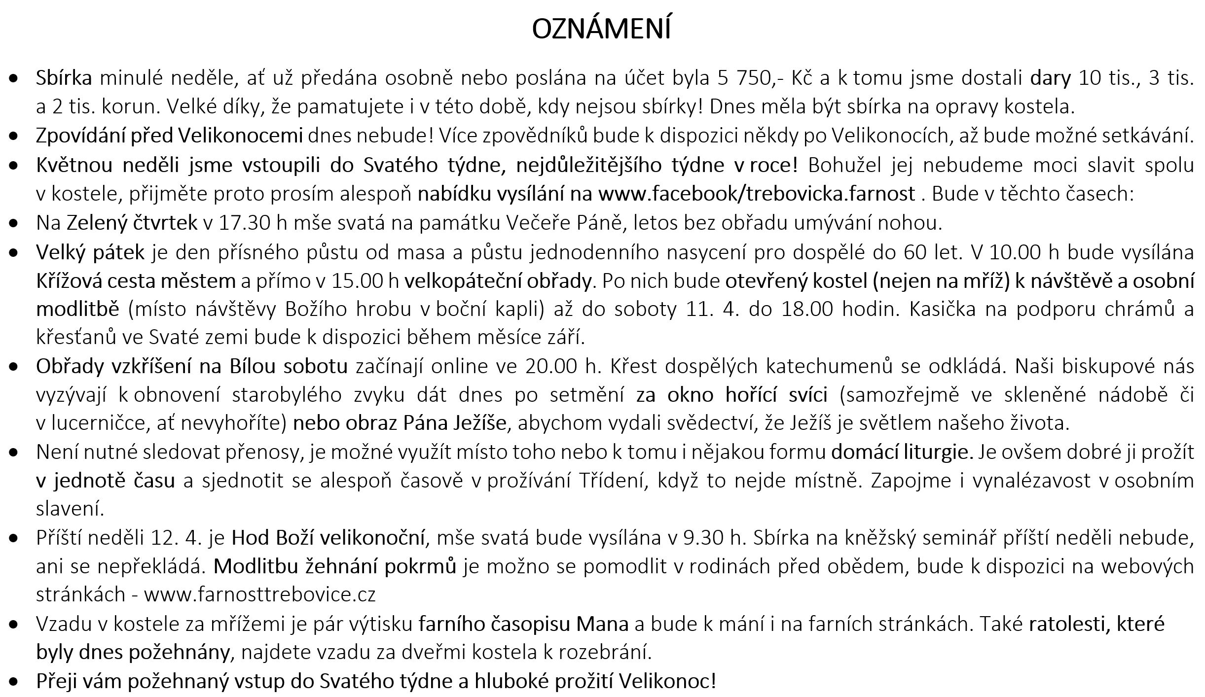 Ohlášky k 5. dubnu V neděli 5. dubna slavíme KVĚTNOU (PAŠIJOVOU) NEDĚLI. Prohlédněte si pořad bohoslužeb a ohlášky. Previous postOhlášky k 29. březnu Next postOhlášky k 12. dubnu Komentáře nejsou povoleny.