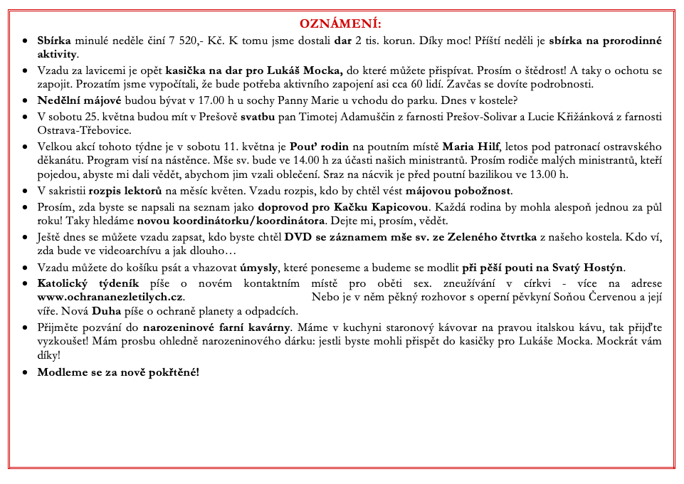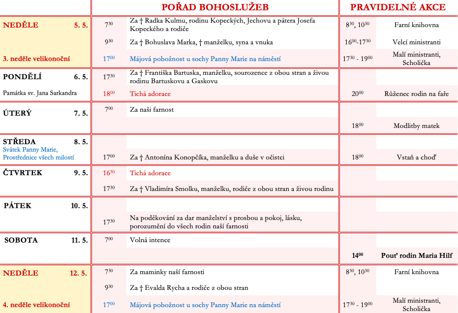 V neděli 5. května slavíme 3. neděli Velikonoční.Prohlédněte si pořad bohoslužeb a ohlášky.