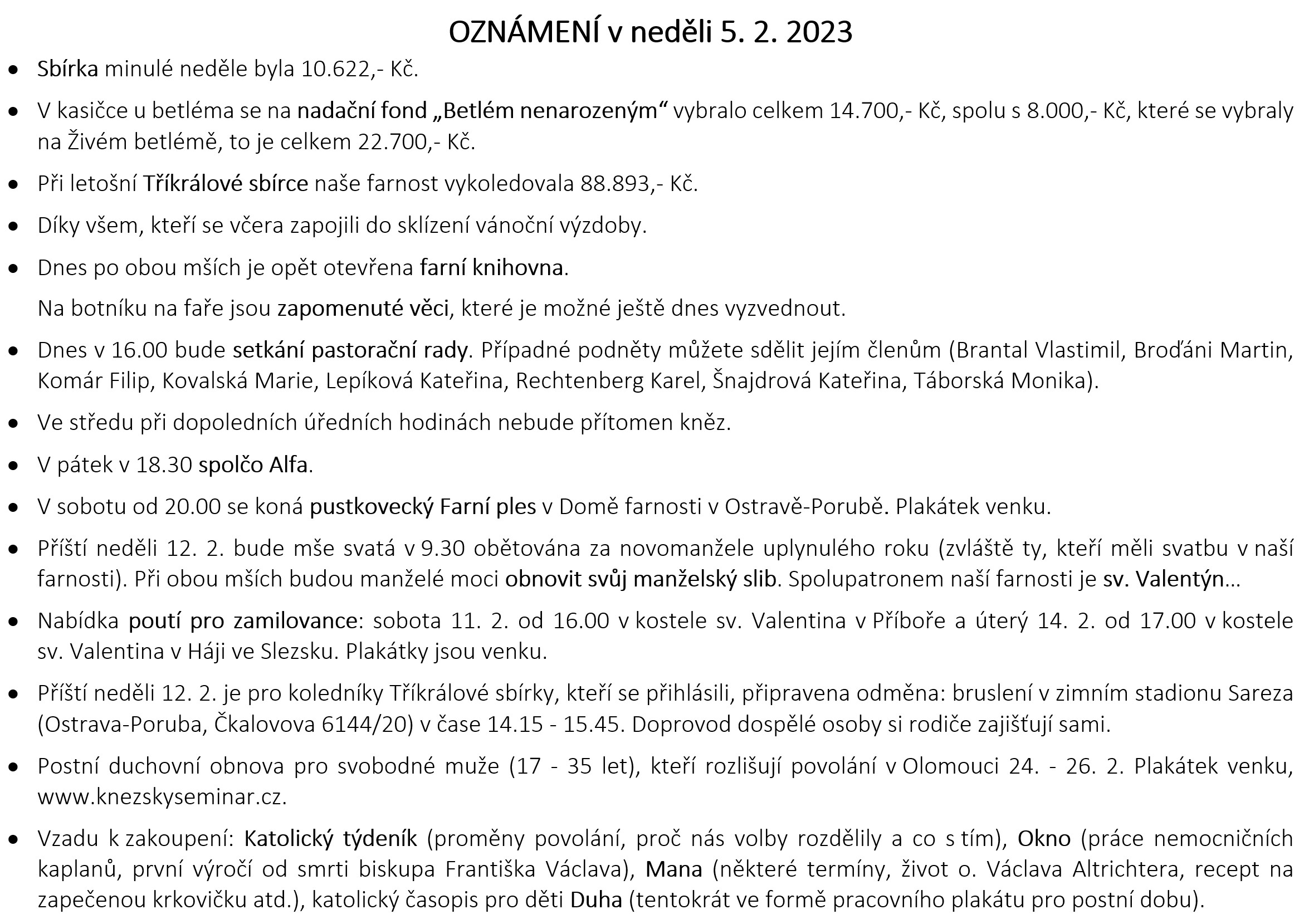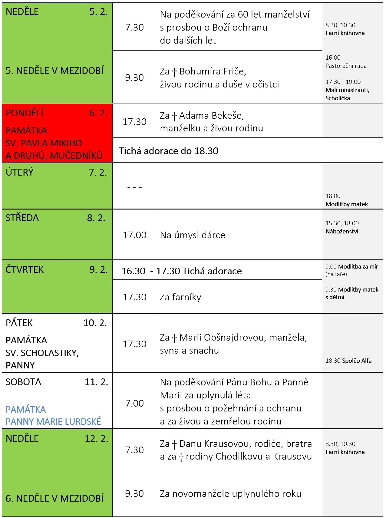 V neděli 5. února slavíme 5. NEDĚLI V MEZIDOBÍ. Prohlédněte si pořad bohoslužeb a ohlášky.