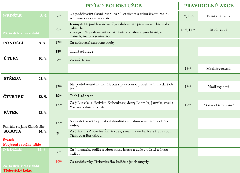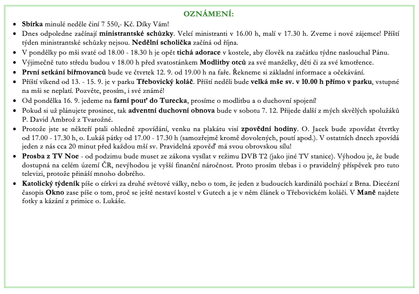 Ohlášky k 8. září V neděli 8. září slavíme 23. neděli v mezidobí. Prohlédněte si pořad bohoslužeb a ohlášky. Previous postOhlášky k 1. září Next postOhlášky k 15. září Komentáře nejsou povoleny.