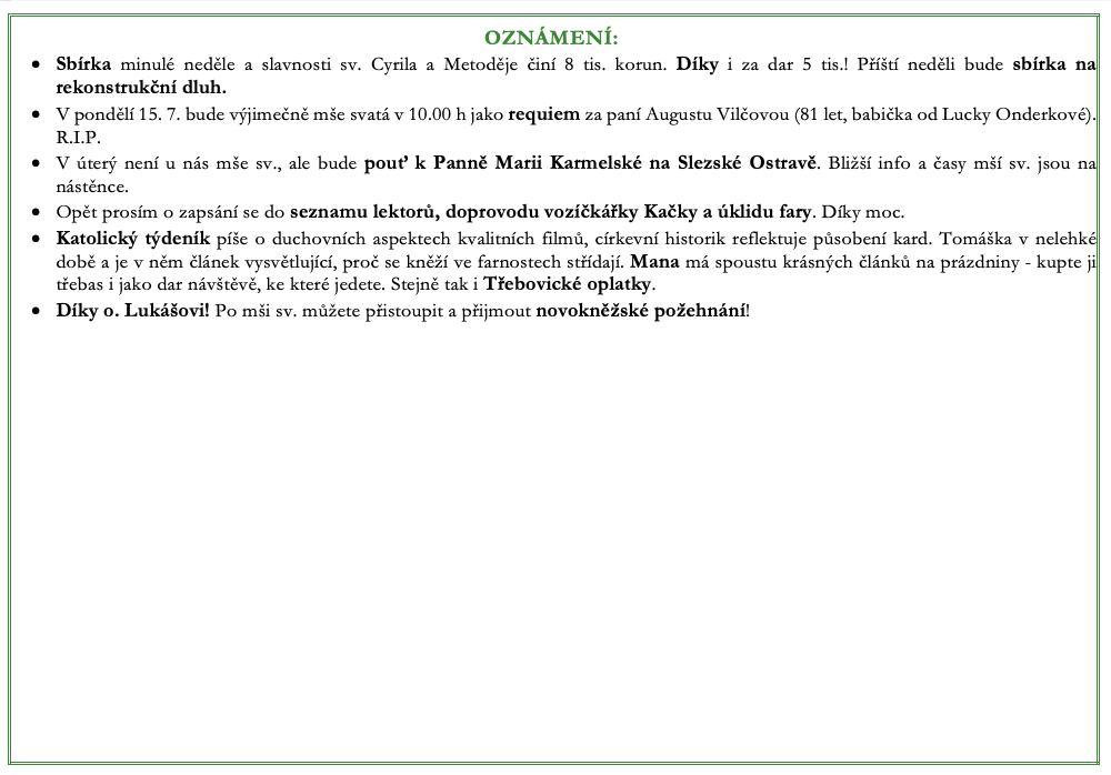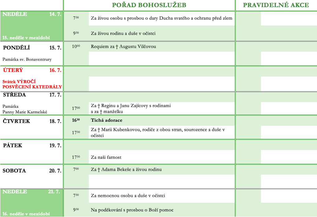 Ohlášky ke 14. červenci V neděli 14. července slavíme 15. neděli v mezidobí. Prohlédněte si pořad bohoslužeb a ohlášky. Previous postOhlášky k 7. červenci Next postOhlášky k 21. červenci Komentáře nejsou povoleny.