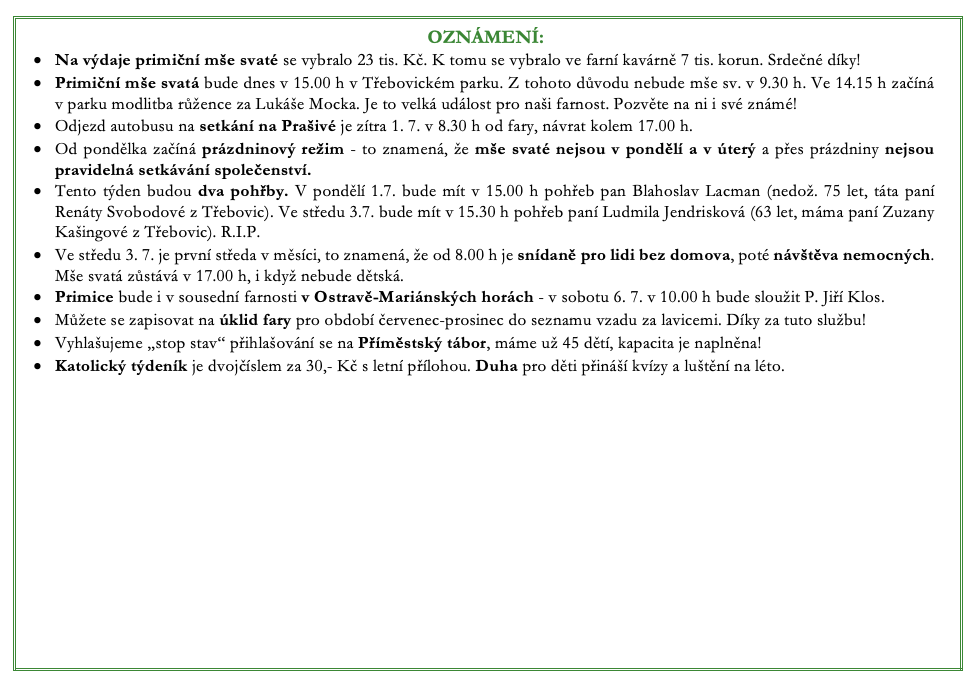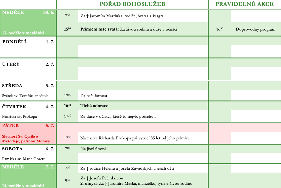 V neděli 30. června slavíme 13. neděli v mezidobí. Prohlédněte si pořad bohoslužeb a ohlášky.