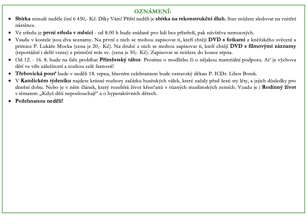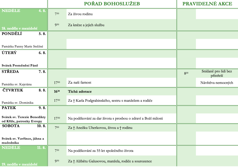 V neděli 4. srpna slavíme 18. neděli v mezidobí. Prohlédněte si pořad bohoslužeb a ohlášky.