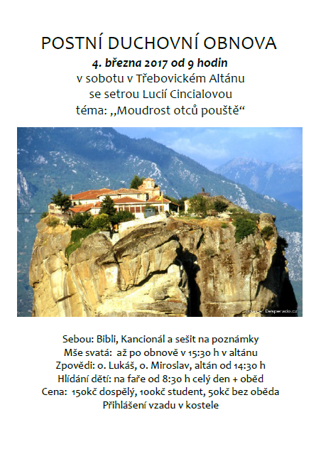 Postní duchovní obnova 4. 3. 2017 Přijměte pozvání k postní duchovní obnově na téma „Moudrost otců pouště“ s Lucií Cincialovou. Previous postVečer chval ve čtvrtek 2. 3. 2017 Next postOhlášky 1. neděle postní Komentáře nejsou povoleny.