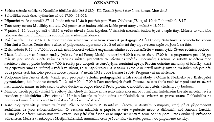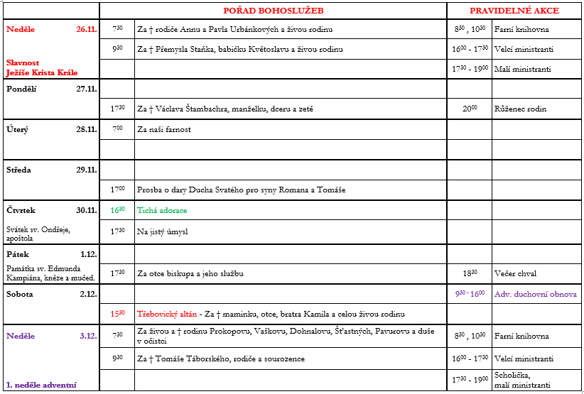 V neděli 26. listopadu slavíme  Slavnost Ježíše Krista Krále. Prohlédněte si pořad bohoslužeb a ohlášky.