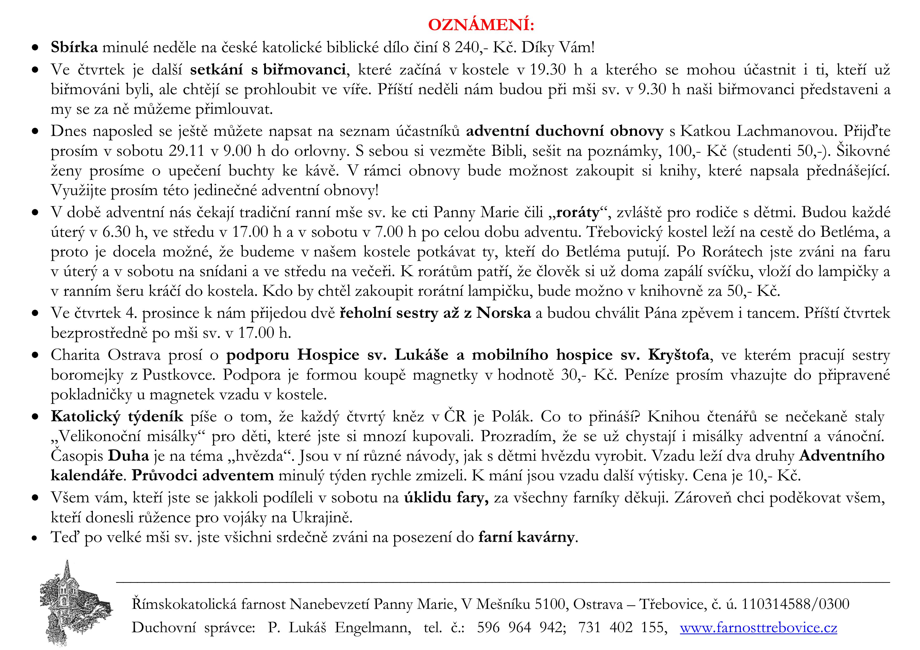 1. neděle adventní – pořad bohoslužeb a ohlášky