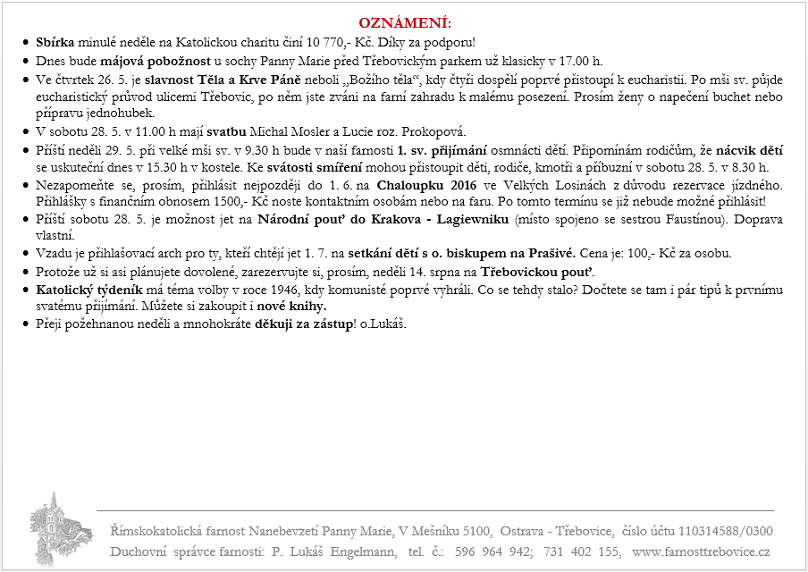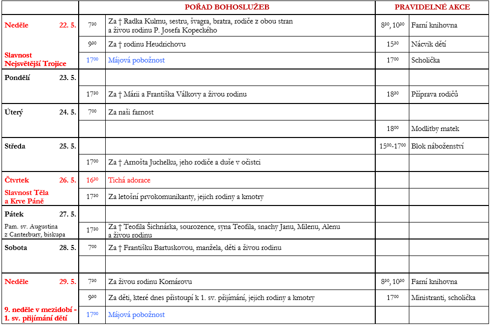 Slavnost Nejsvětější Trojice V neděli 22. května slavíme Slavnost Nejsvětější Trojice. Prohlédněte si pořad bohoslužeb a ohlášky. Previous postSlavnost Seslání Ducha Svatého Next postNoc Kostelů Komentáře nejsou povoleny.