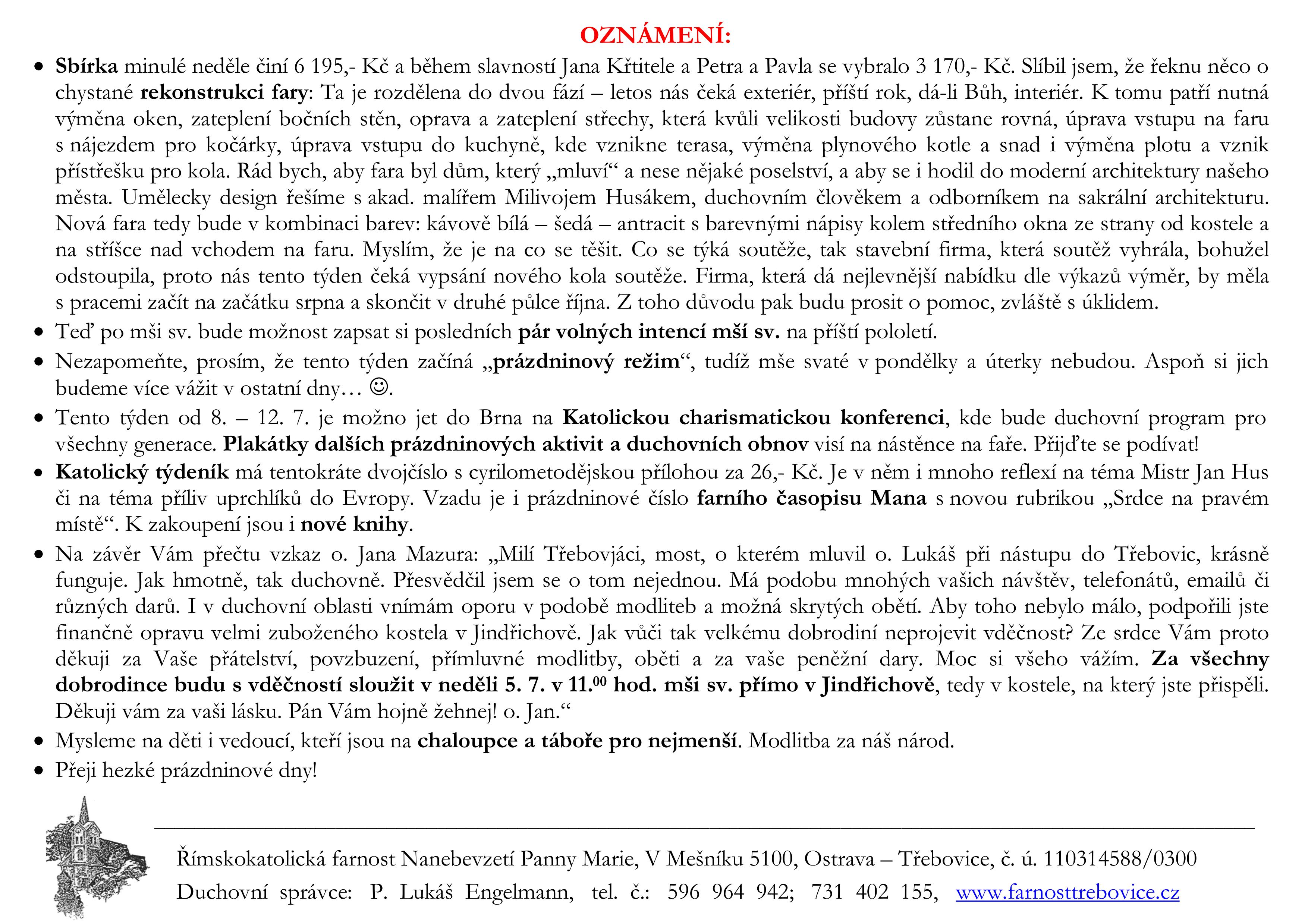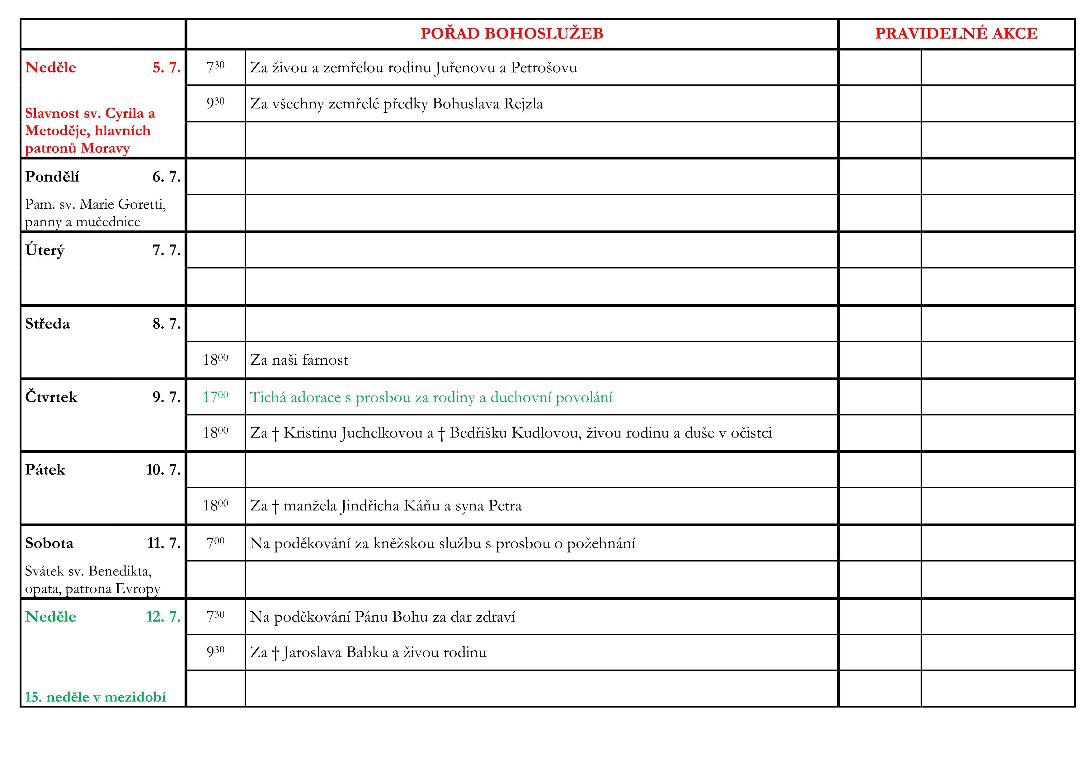 V neděli 5. července slavíme Slavnost sv. Cyrila a Metoděje, hlavních patronů Moravy. Prohlédněte si pořad bohoslužeb a ohlášky.