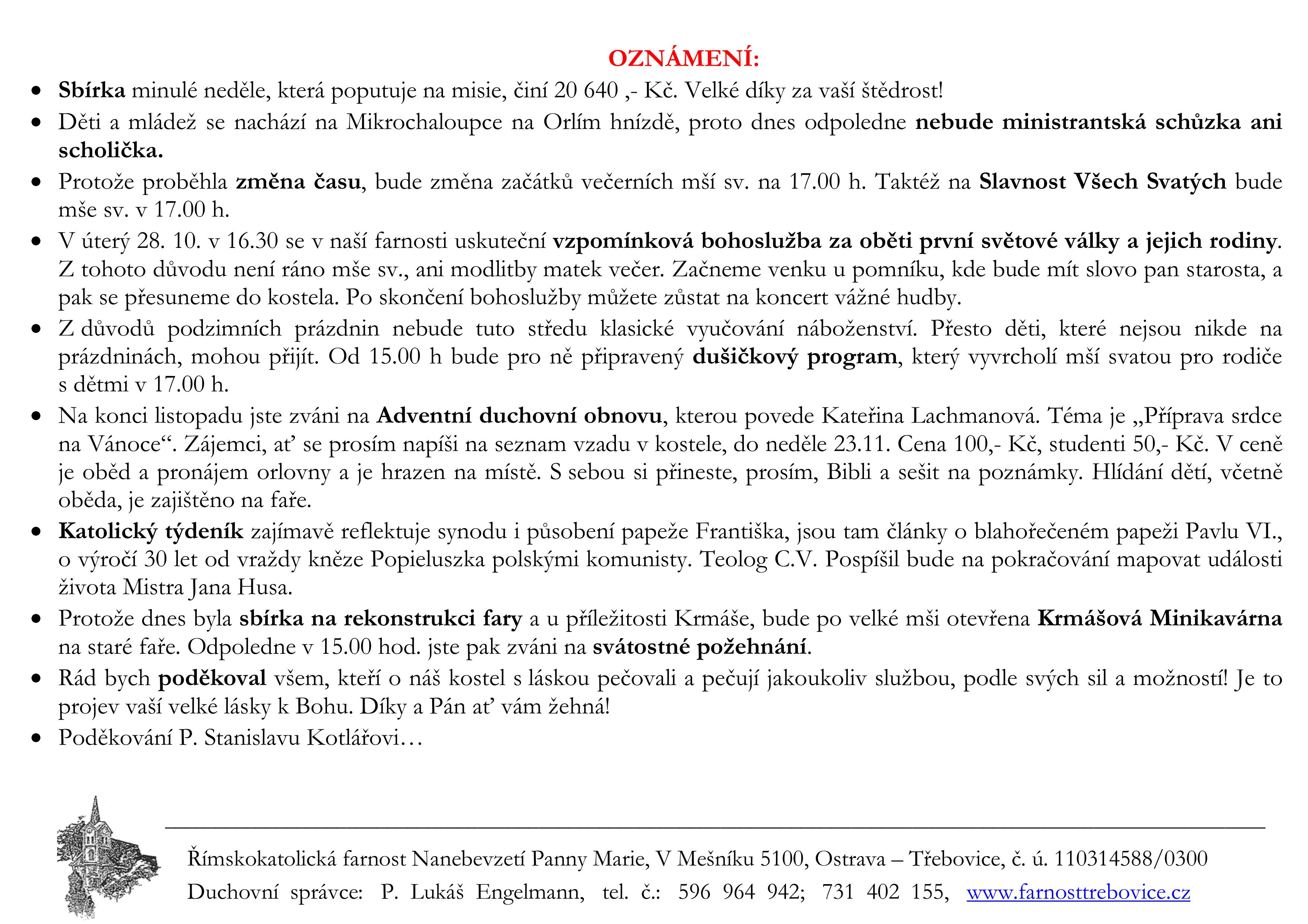 V neděli 26. října slavíme Výročí posvěcení našeho kostela. Prohlédněte si pořad bohoslužeb a ohlášky.