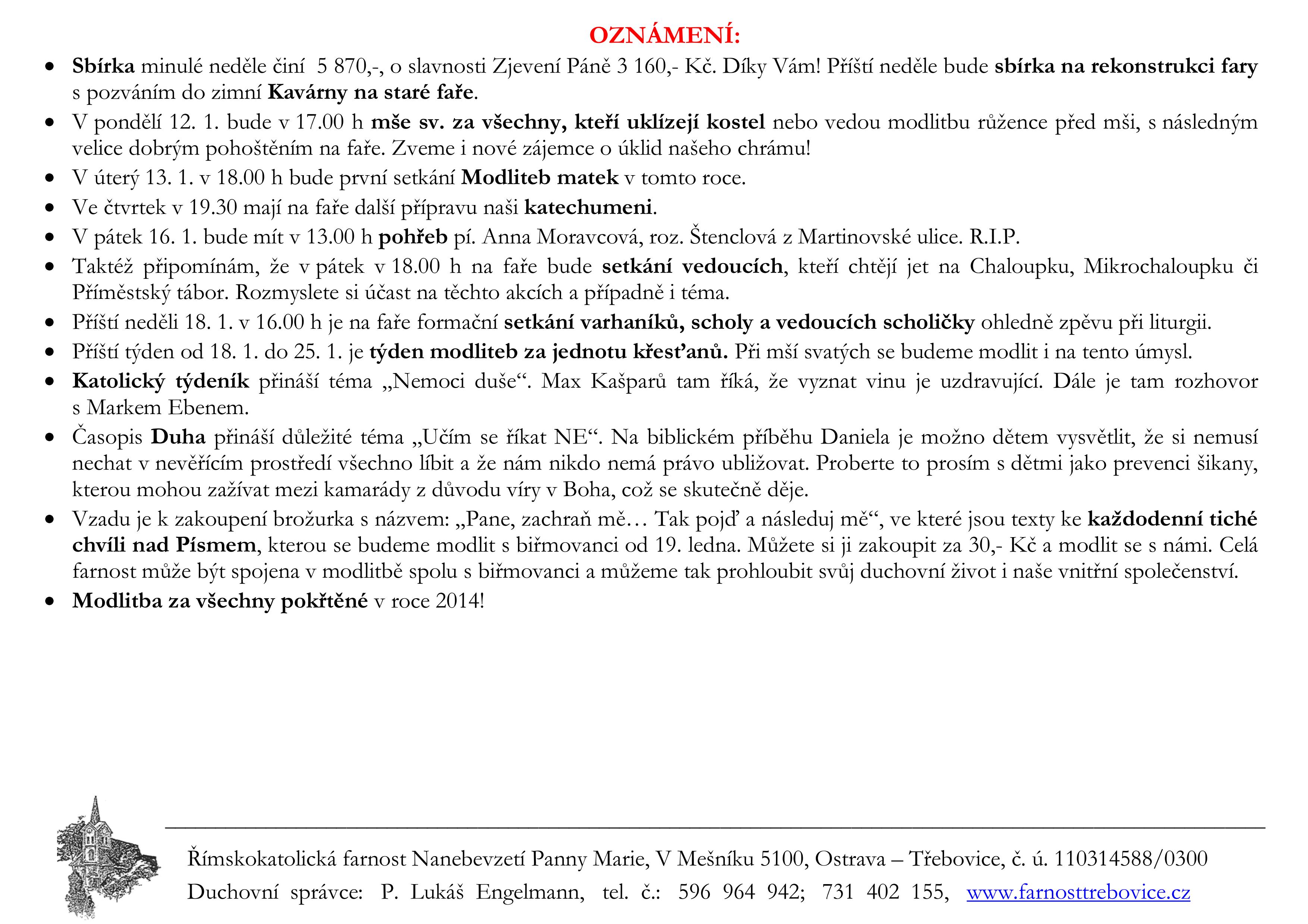 Svátek Křtu Páně V neděli 11. ledna slavíme Svátek Křtu Páně. Prohlédněte si pořad bohoslužeb a ohlášky. Previous post2. neděle po Narození Páně Next post2. neděle v mezidobí (Panna Maria, Matka jednoty křesťanů) Komentáře nejsou povoleny.