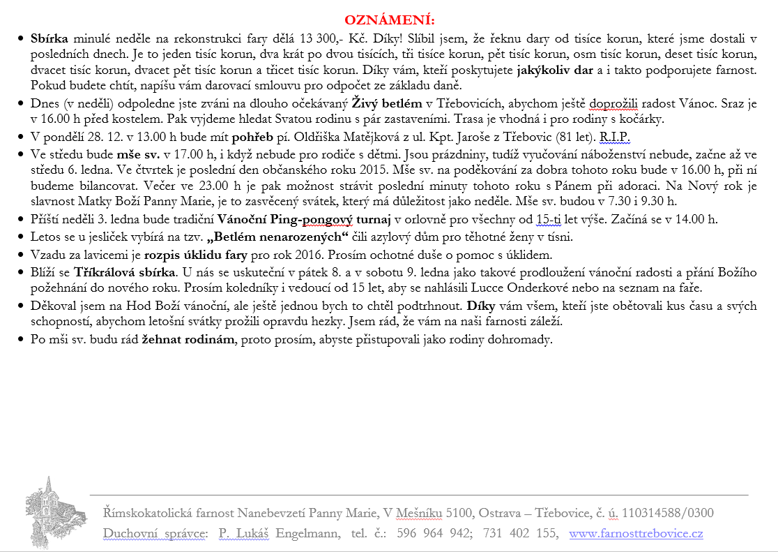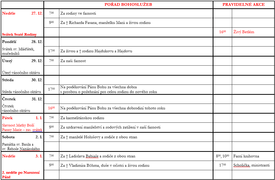 Svátek Svaté Rodiny V neděli 27. prosince slavíme Svátek Svaté Rodiny. Prohlédněte si pořad bohoslužeb a ohlášky. Previous post4. neděle adventní Next post2. Neděle po Narození Páně Komentáře nejsou povoleny.